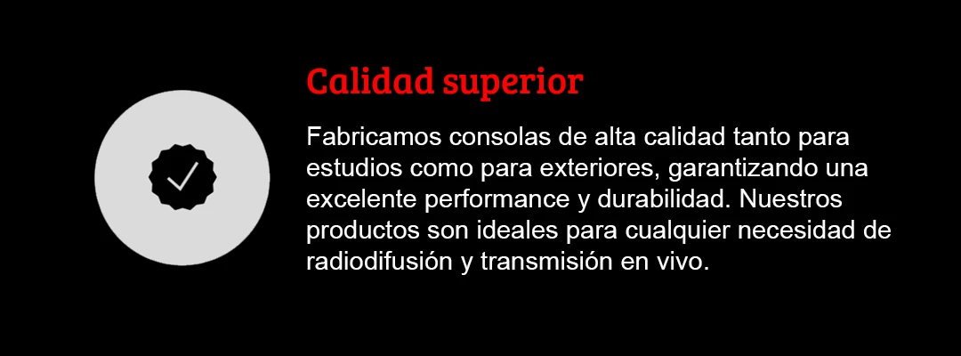 Fabricamos consolas de alta calidad tanto para estudios como para exteriores, garantizando una excelente performance y durabilidad. Nuestros productos son ideales para cualquier necesidad de radiodifusión y transmisión en vivo.
